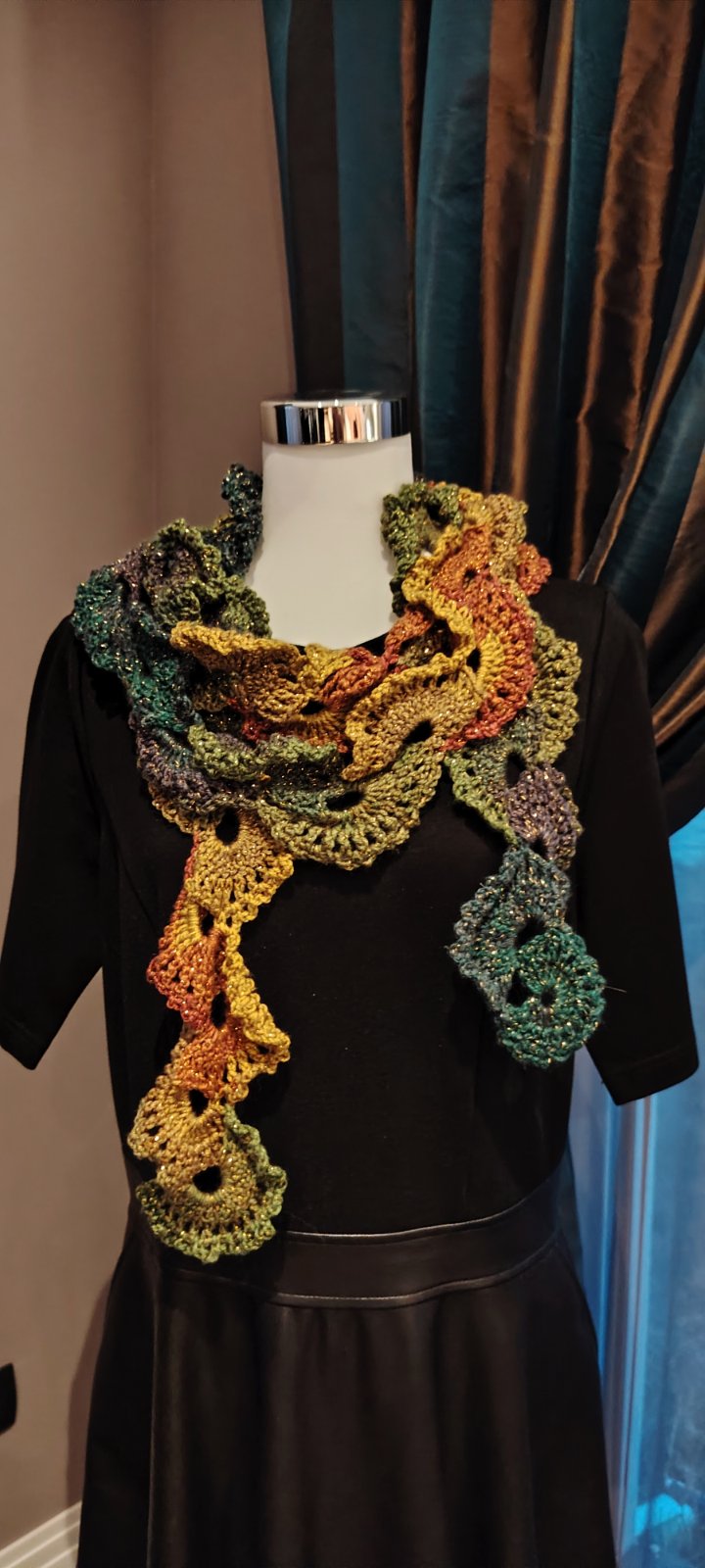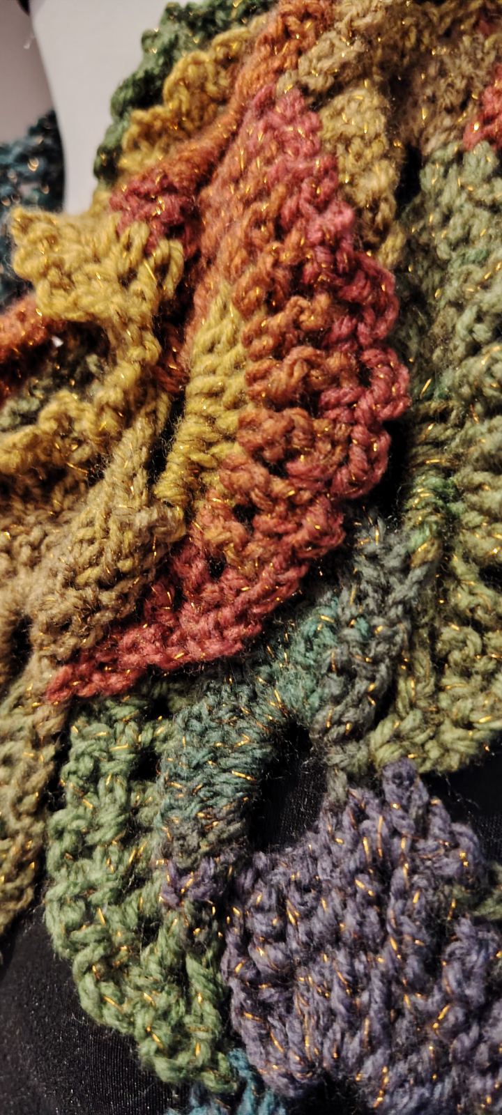 Meleg, sárgás-barna-piros árnyalatú sál, amely az őszi erdő minden színét magán viseli. A fonalban apró aranyszálak csillannak – pont annyira, hogy élettel telivé tegyék.
