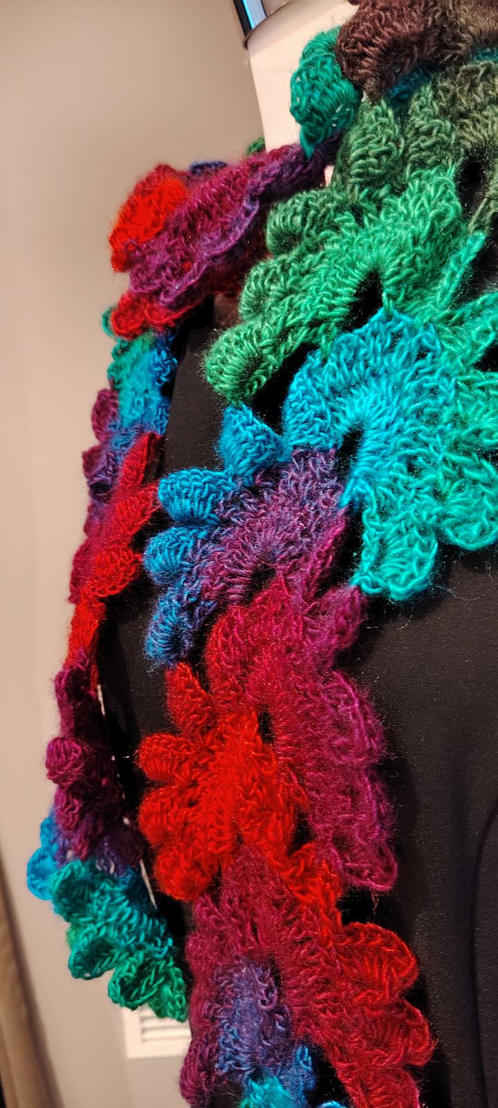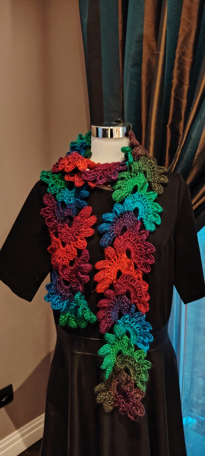 Ez a horgolt sál aprólékos mintázatával és átmenetes, szivárványos fonalával egyszerre bohém és elegáns.